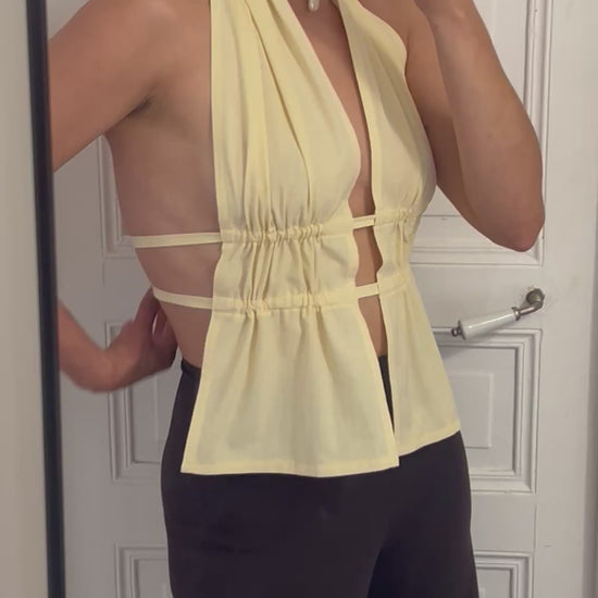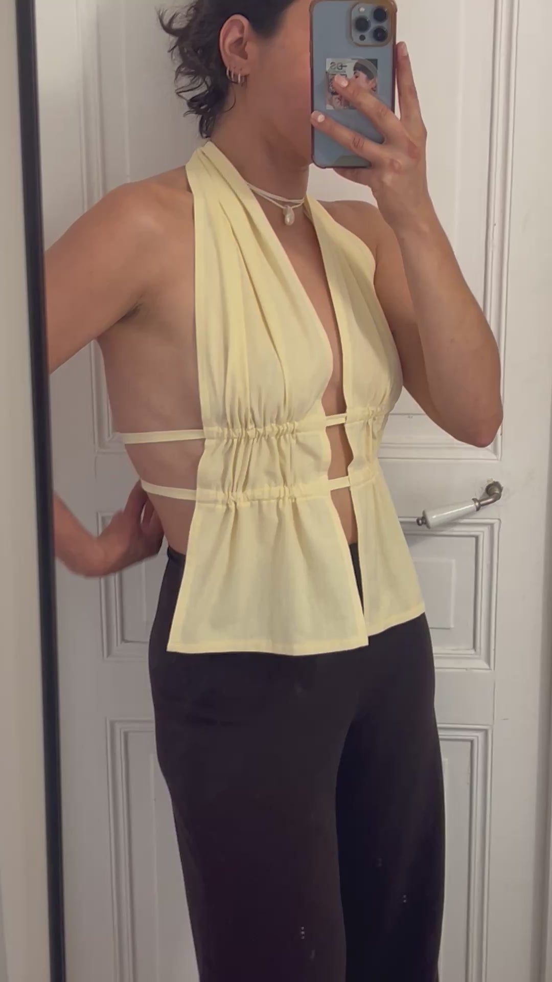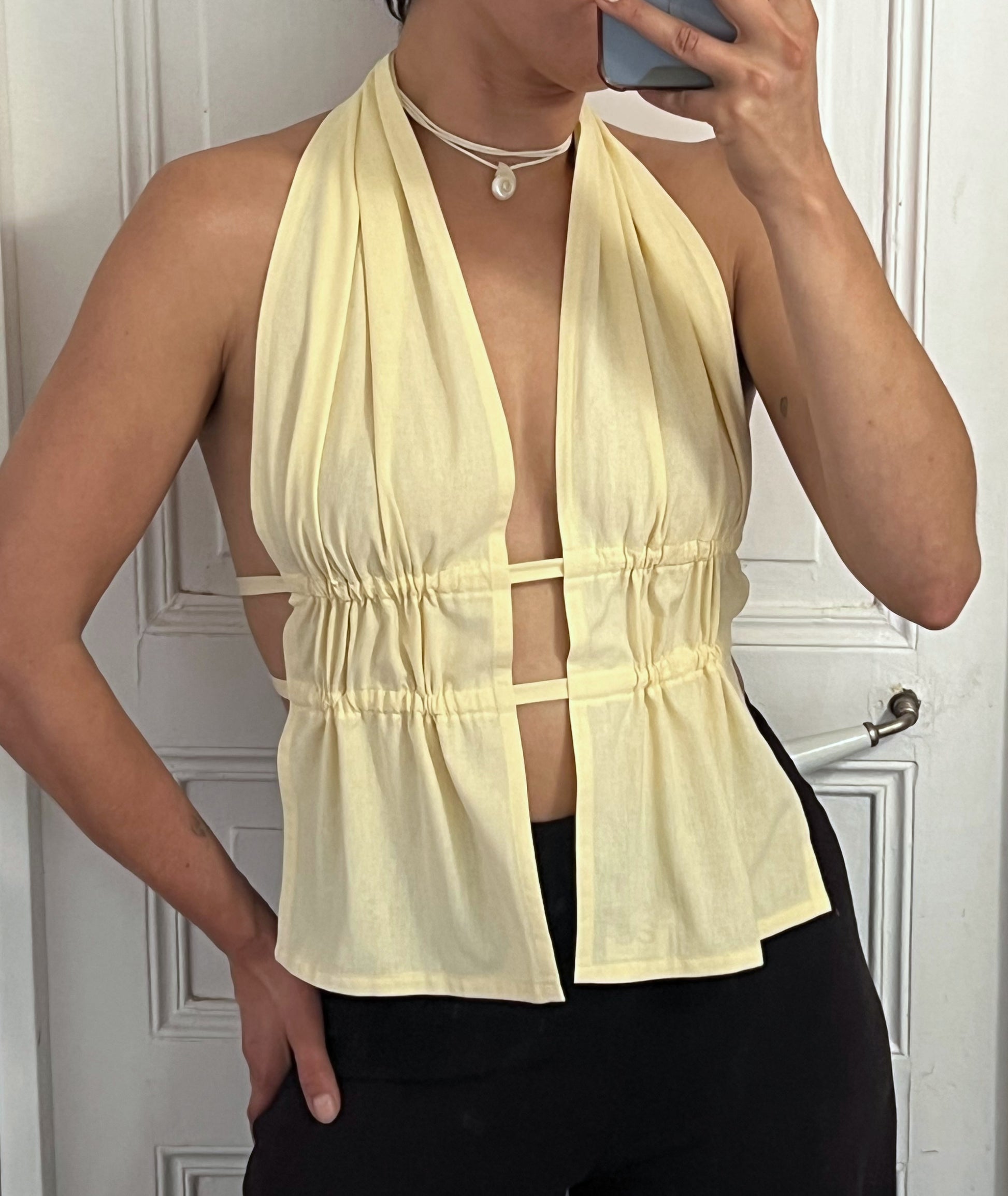 Taille unique qui convient à un large éventail, les bandes de devant (22cm de large) et les ficelles s'ajustent selon l'envie et la morphologie.