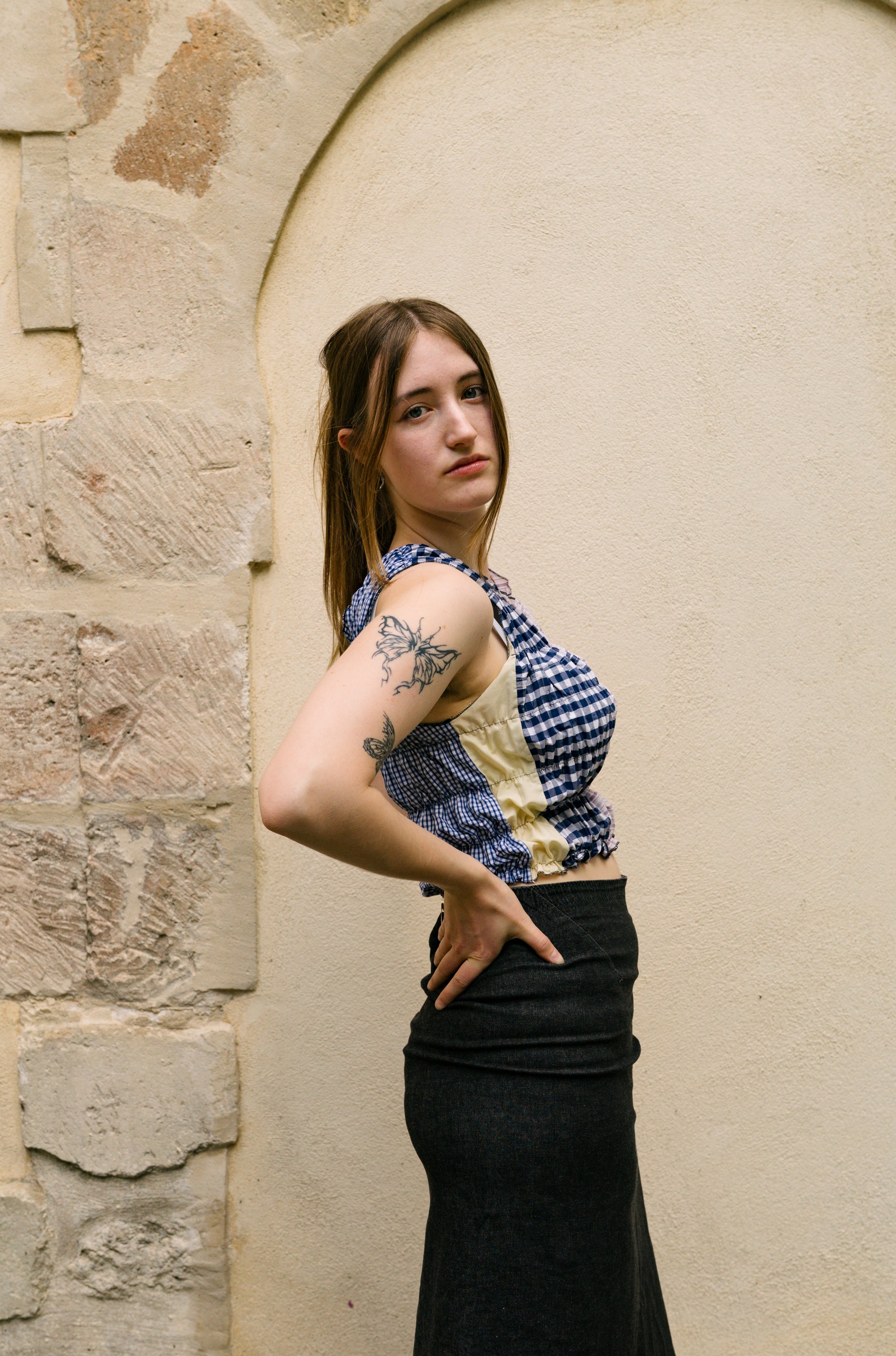 Le top Romy est un top patchwork froncé conçu à partir de chutes de chemises et d'un tissu dormant.